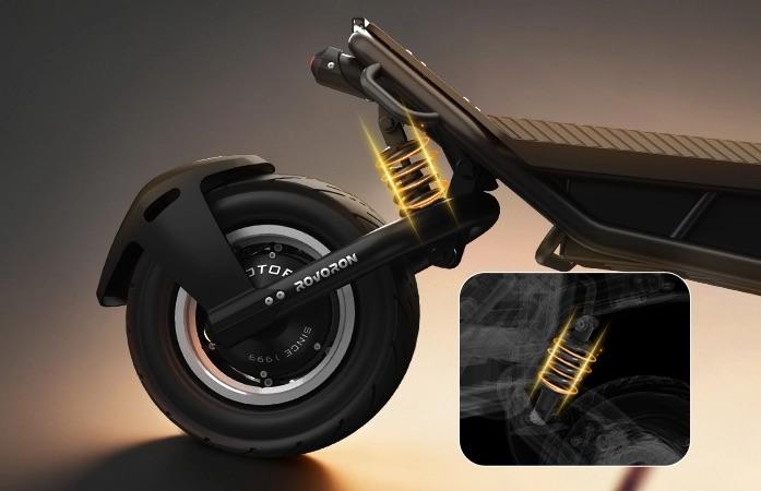 Cada detalle de la Rovoron R7 está diseñado para tu comodidad. Las suspensiones delanteras y traseras absorben eficazmente los impactos y las irregularidades de la carretera. Los neumáticos tubeless de 11 pulgadas mejoran la adherencia y reducen las vibraciones. Puedes conducir durante más tiempo con menos fatiga.
